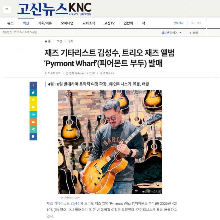 [기사] 재즈 기타리스트 김성수, 트리오 재즈 앨범 ‘Pyrmont Wharf’(피어몬트 부두) 발매(고신뉴스 KNC)
