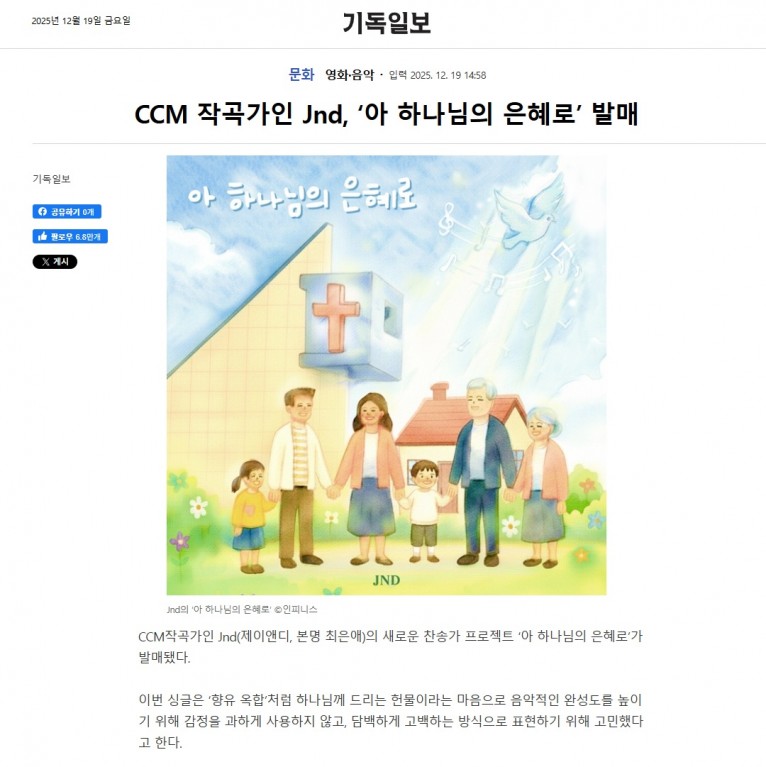 [기사] CCM 작곡가인 Jnd, ‘아 하나님의 은혜로’ 발매(기독일보)