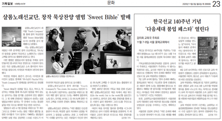 뮤직타임 [기사] 샬롬노래선교단, 창작 묵상찬양 앨범 ‘Sweet Bible’ 발매(기독일보)