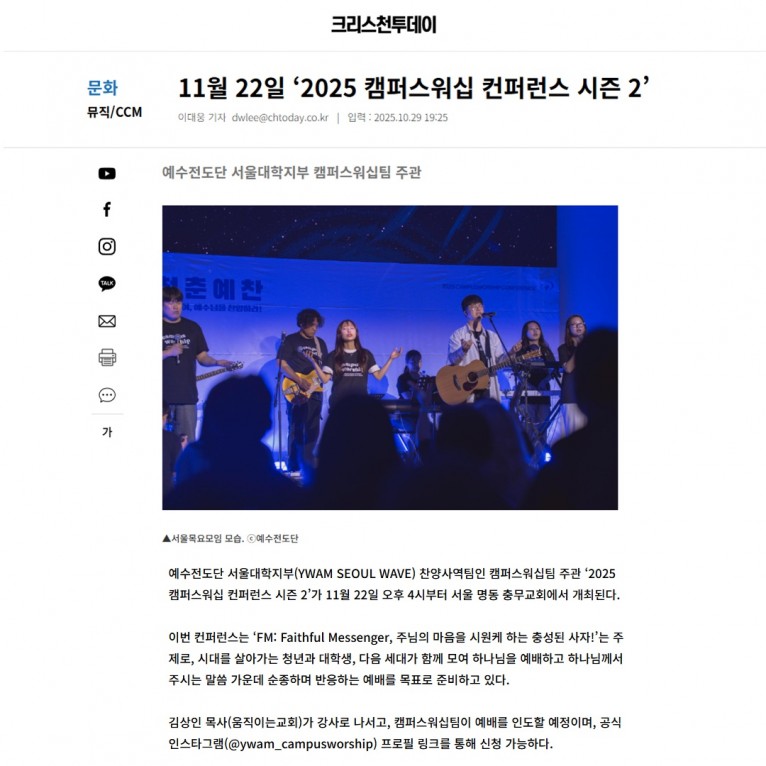 뮤직타임 [기사] 11월 22일 ‘2025 캠퍼스워십 컨퍼런스 시즌 2’(크리스천투데이)