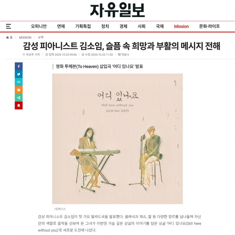[기사] 감성 피아니스트 김소임, 슬픔 속 희망과 부활의 메시지 전해(자유일보)